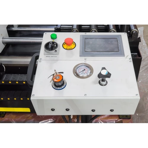 Панель управления выведена консолью к станку, для удобства оператора. Длина подачи заготовки контролируется автоматически c ЧПУ (СNC). ЧПУ станка строится на PLC контроллере. Сенсорный дисплей управления. |