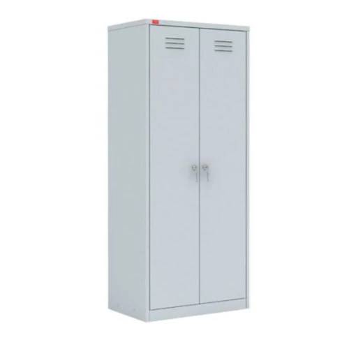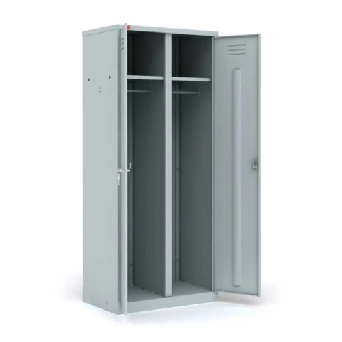 Шкаф металлический разборный двухсекционный, предназначен для хранения сменной одежды. В стандартную комплектацию каждой секции входят съемная полка для головного убора, перекладина для вешалки и крючки для одежды.   Шкаф оснащен врезным замком. Полимерное порошковое покрытие светло-серого цвета (raL 7035).